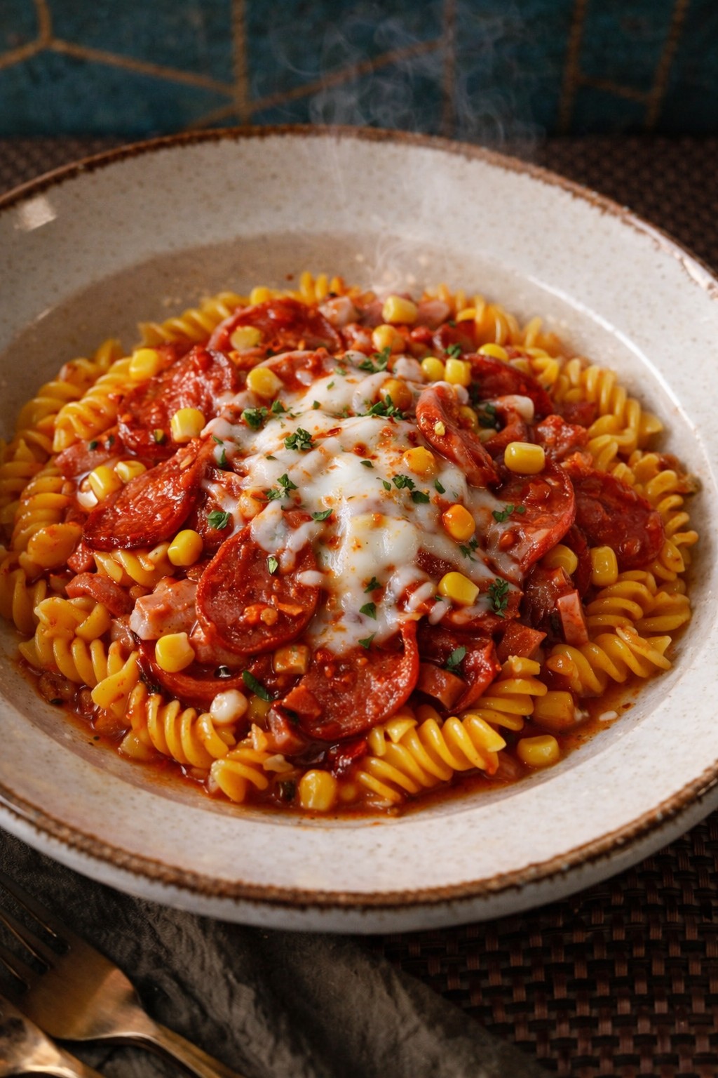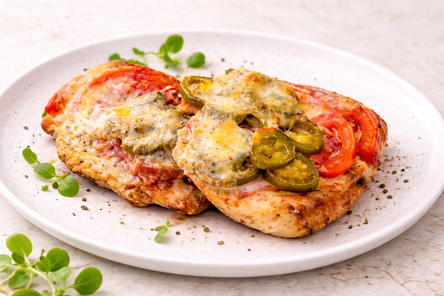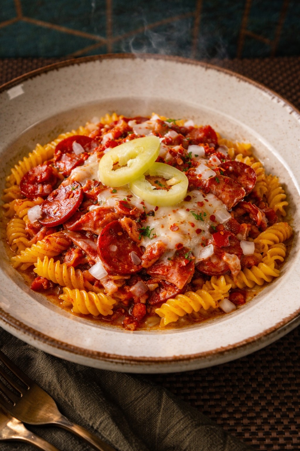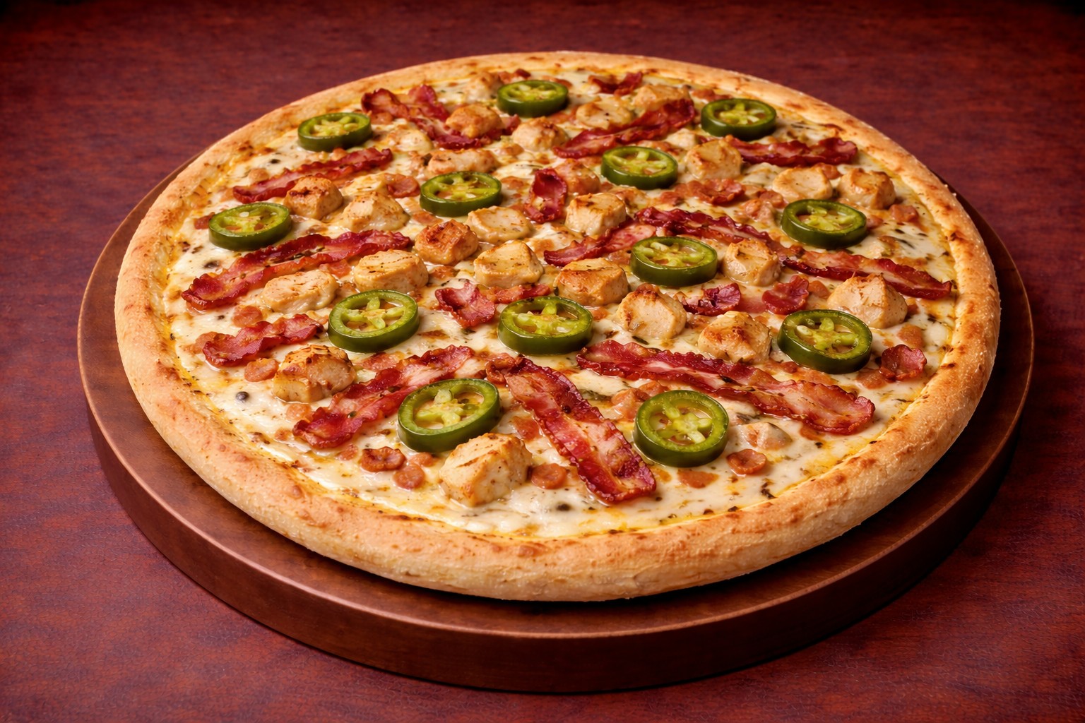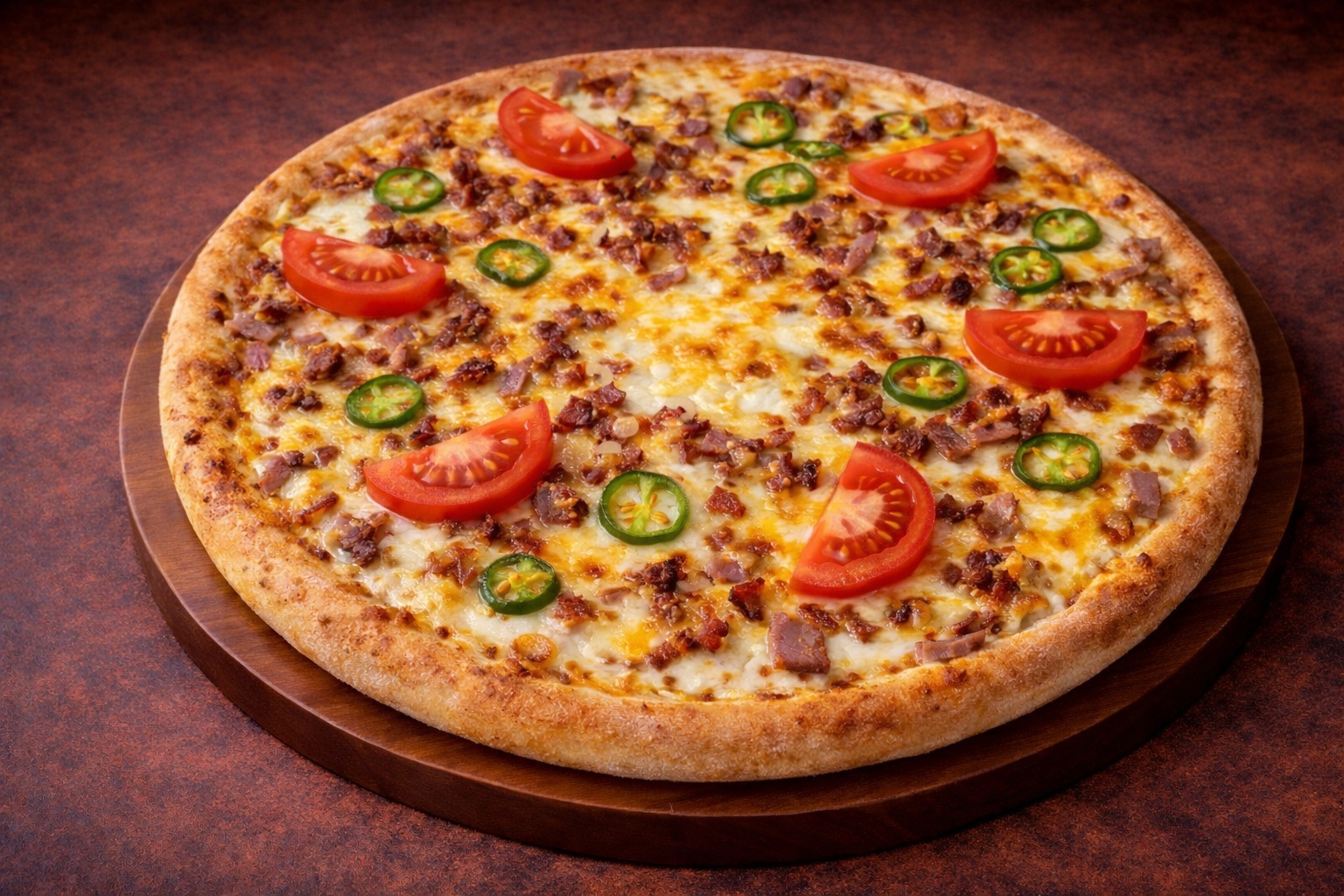 paradicsomos-tejszínes szósz, sonka, paprikás szalámi, bacon, sajt, paprika, vöröshagyma