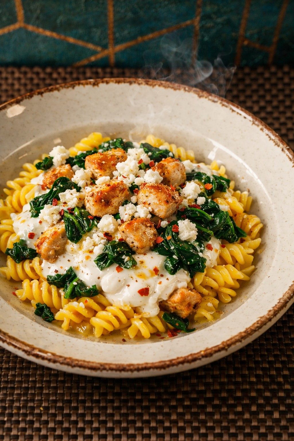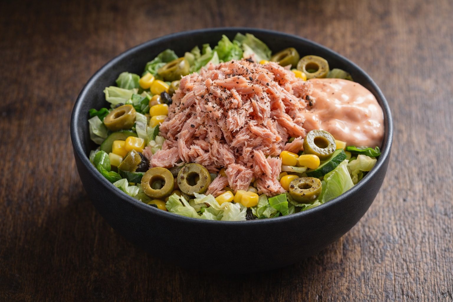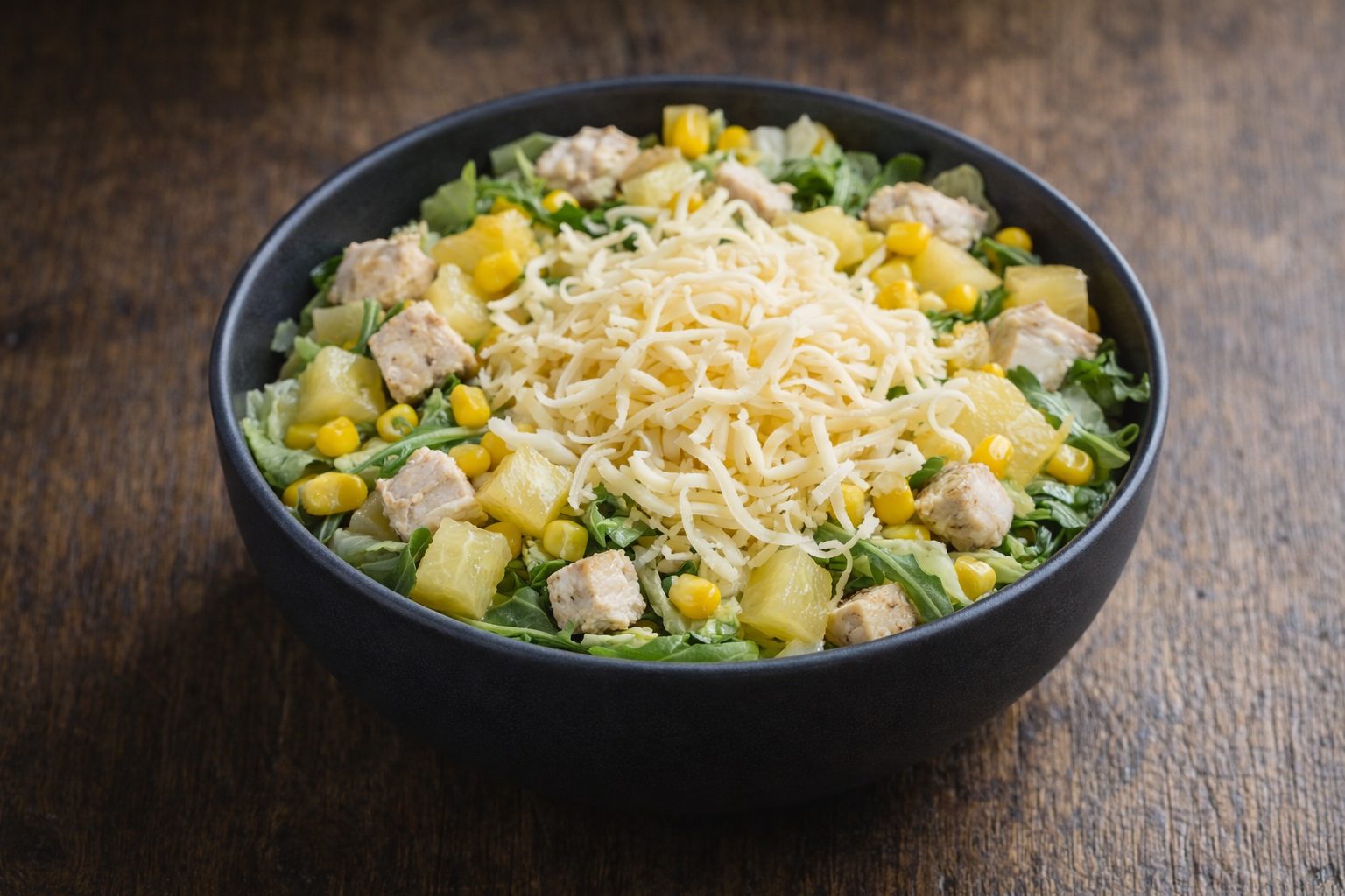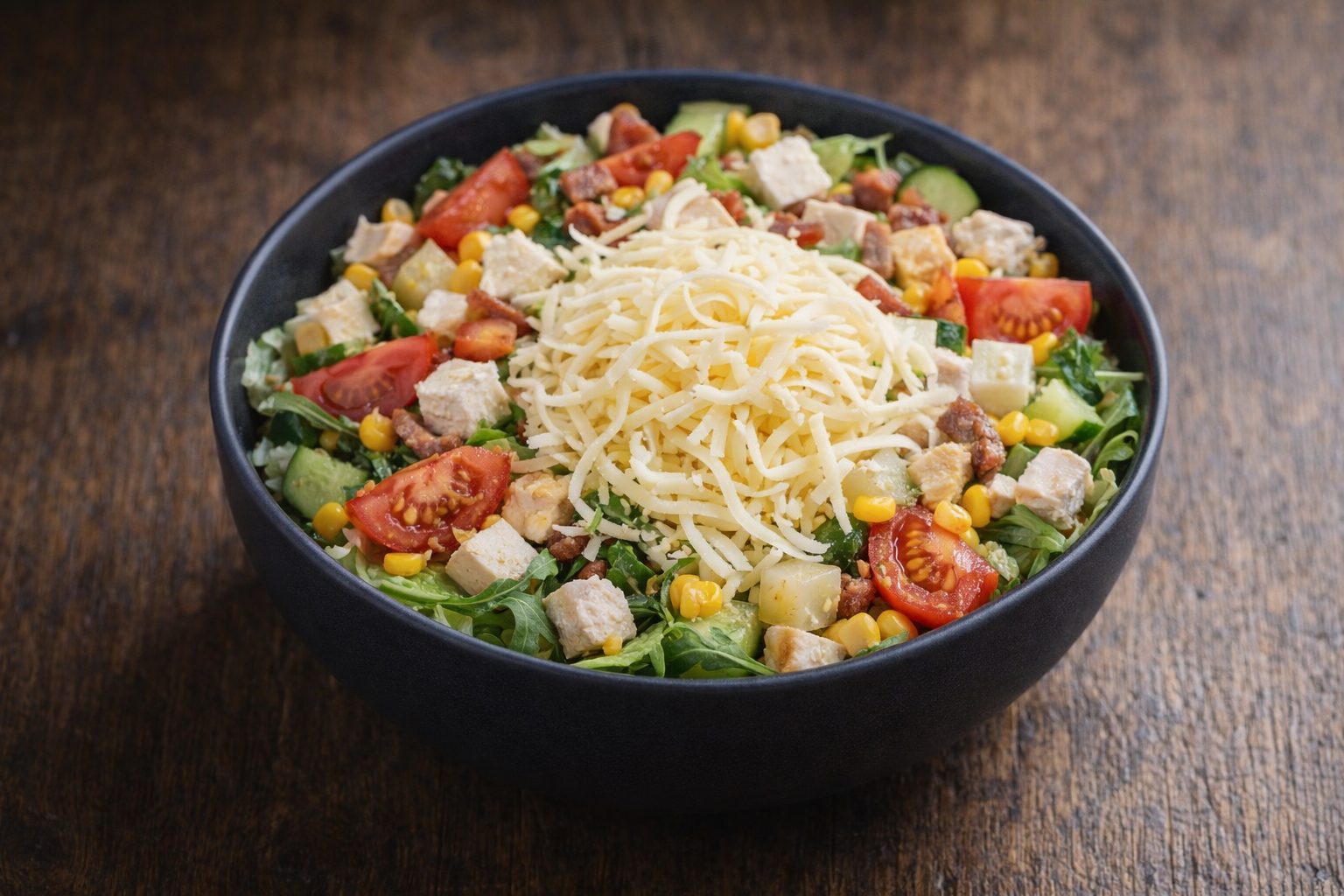 jégsaláta, rukkola, paradicsom, sajt, uborka, feta sajt, bacon, csirkemellcsíkok, kukorica