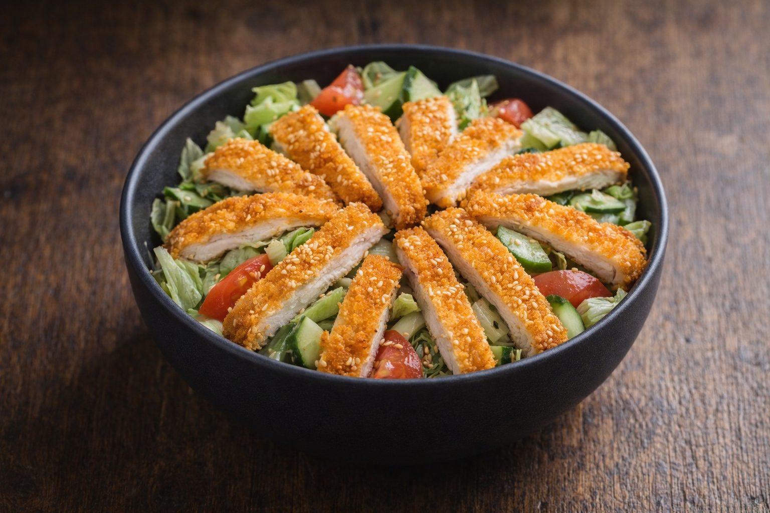 jégsaláta, paradicsom, uborka, szezámmagos rántott csirkemell csíkok,választható öntet