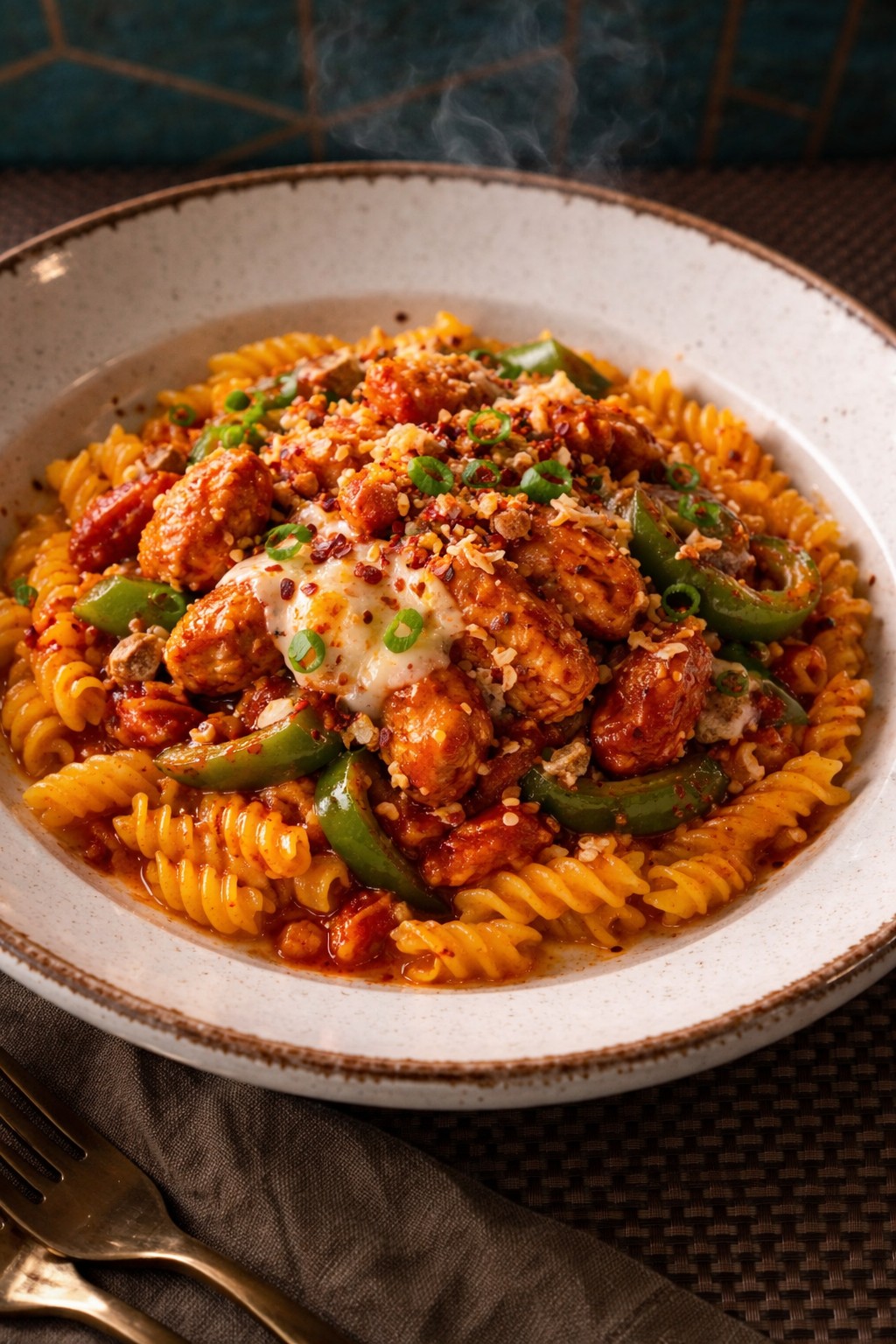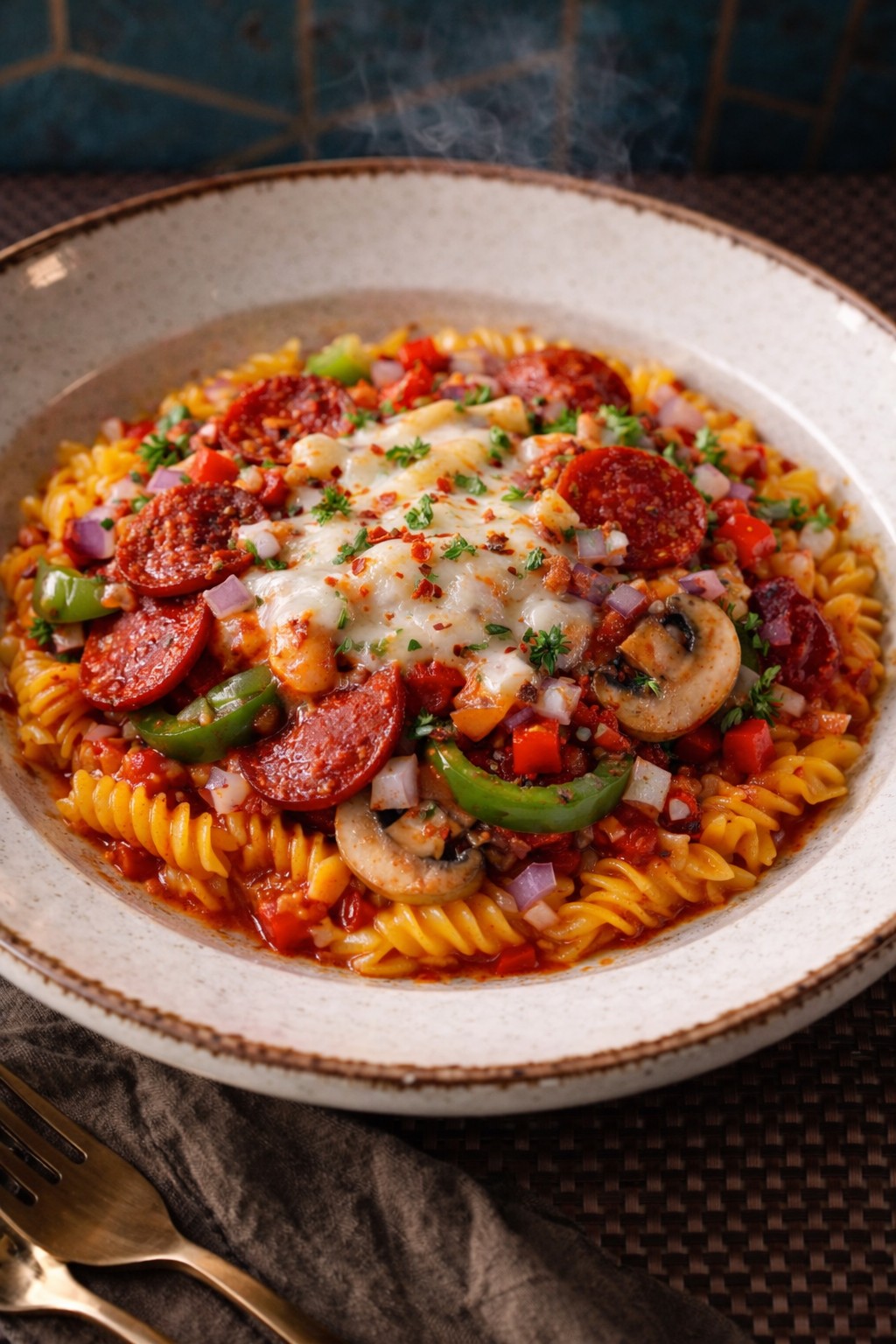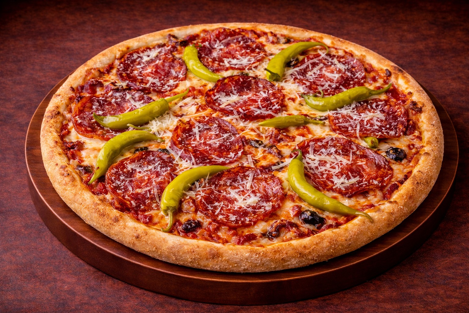 paradicsomos-tejszínes szósz, paprikás szalámi, gomba, lilahagyma, kaliforniai paprika, hegyes erős, sajt