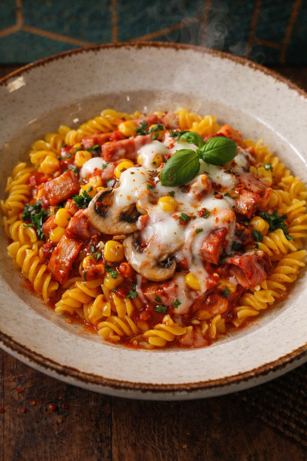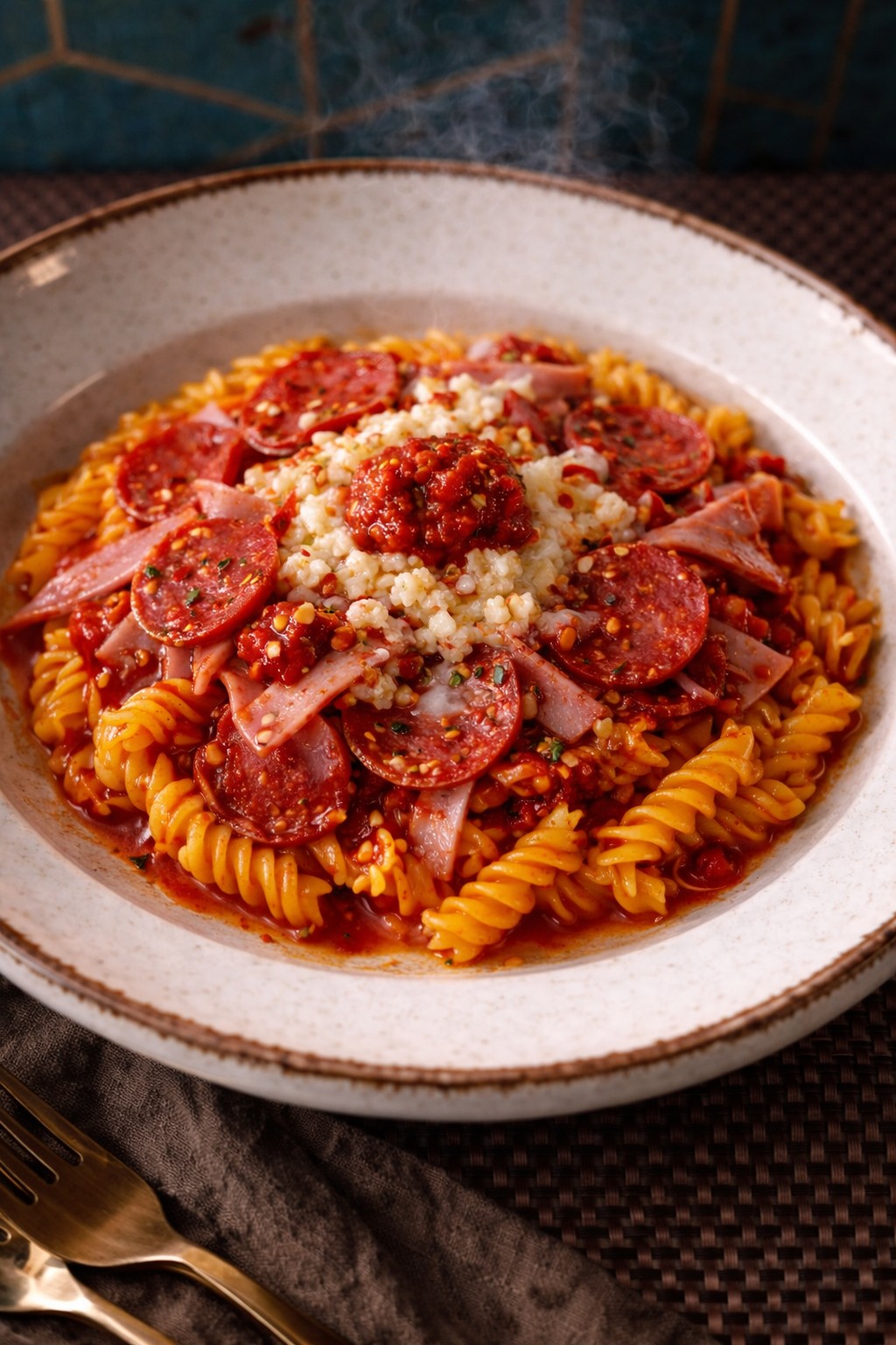 paradicsomos-erős pistás szósz, sonka, paprikás szalámi, fokhagyma, sajt