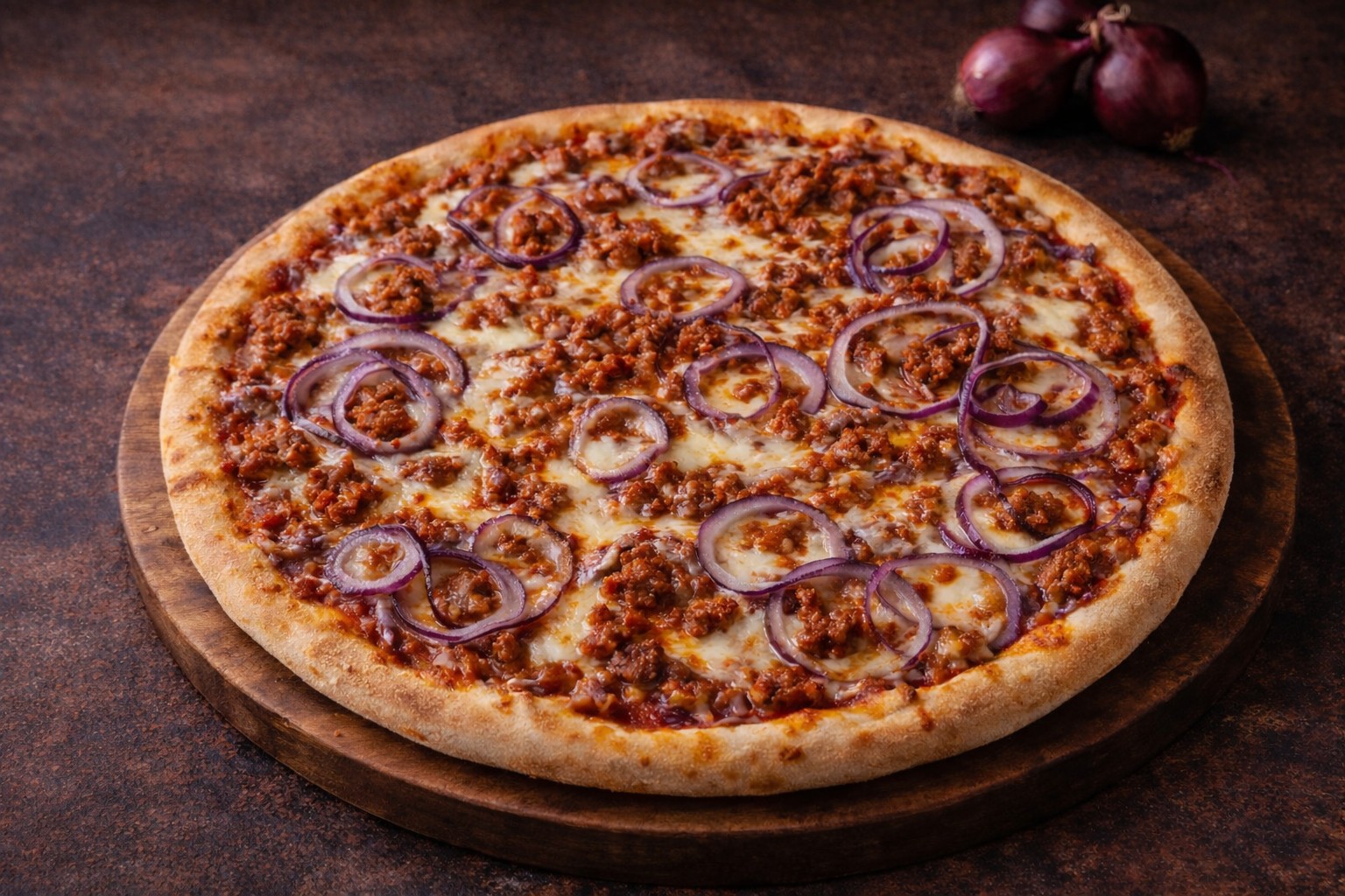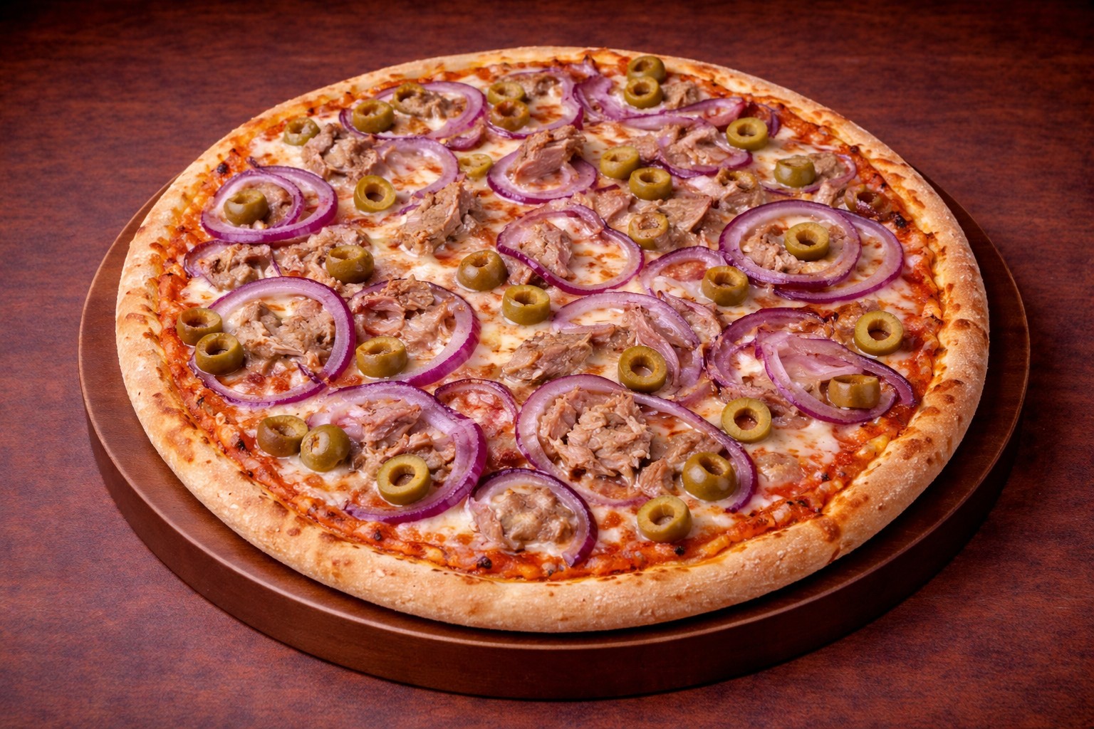 paradicsomos alap, mozzarella, tonhal, lila hagyma, olívabogyó