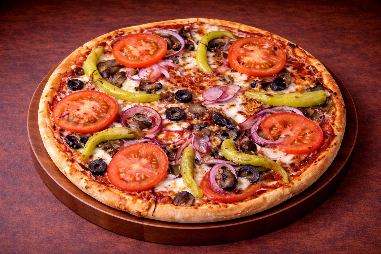 paradicsomos alap, csípős szalámi, gomba, lilahagyma, kaliforniai paprika, mozzarella, zöld erős paprika