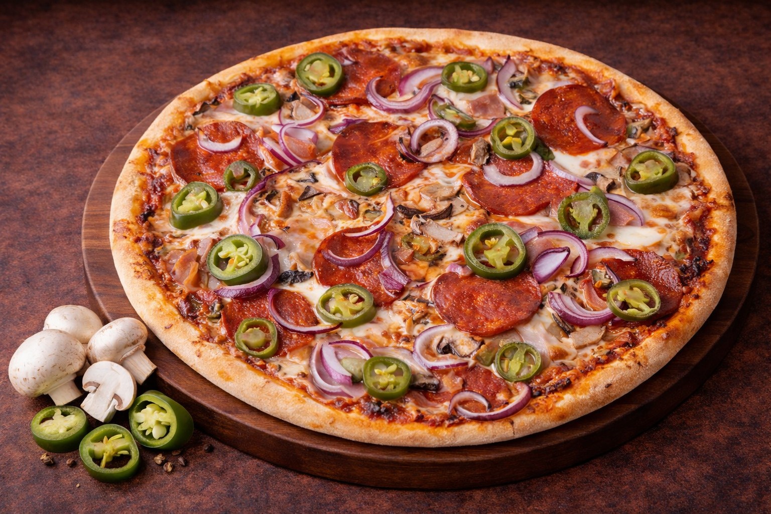 csípős paradicsomos alap, mozarella, szalámi, bacon, lila hagyma, gomba, jalapeno