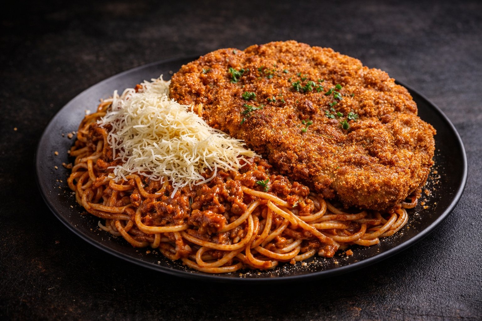 bolognai spagetti rántott sertésszelettel és reszelt sajttal.