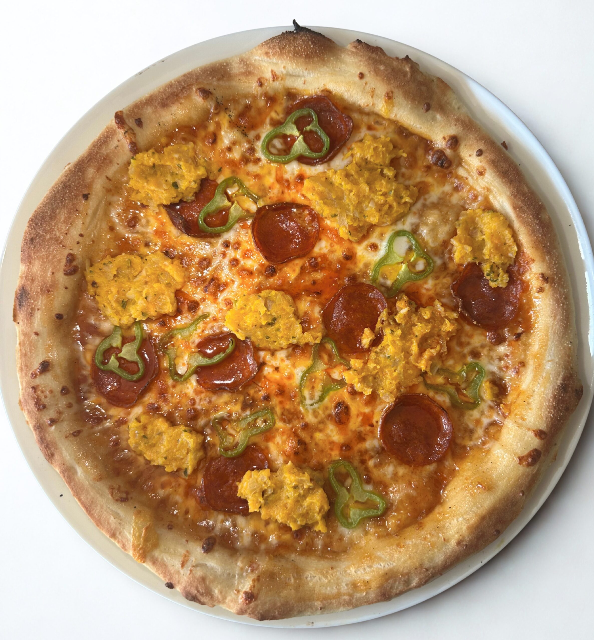 csípős paradicsomos alap, füstölt és grill tarja, mozzarella, zöld erős paprika, jalapeno, tabasco szósz